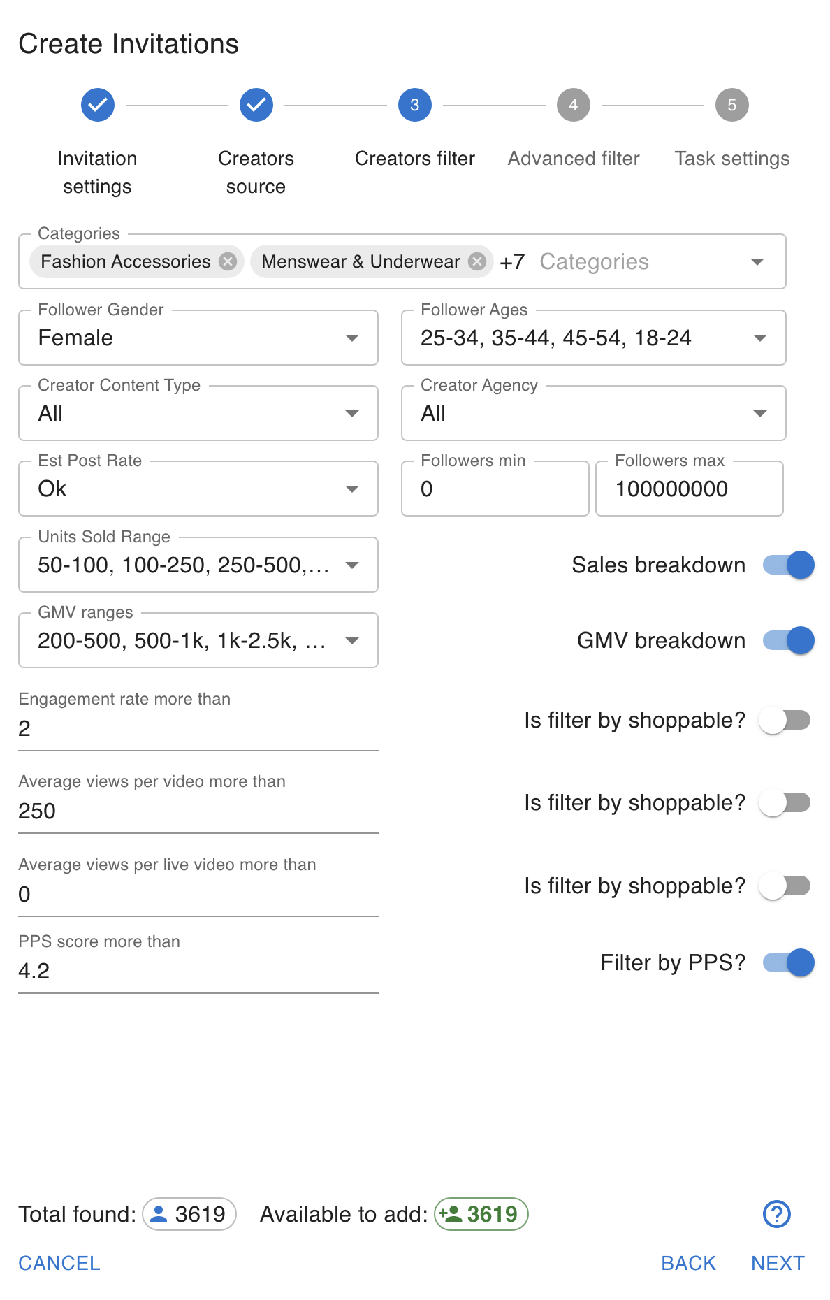 Filter creators by category, GMV, audience demographics, and performance metrics to build high-converting influencer campaigns.